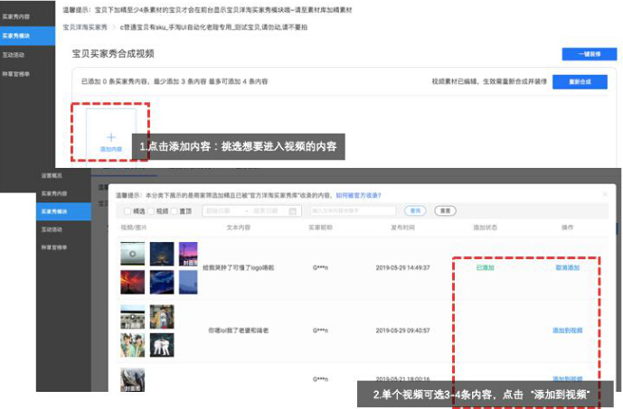 第二步:点击添加内容,会弹出窗口展示你这个宝贝下被官方收录的买家秀内容,挑选想要合成视频的内容,点击添加视频即可。