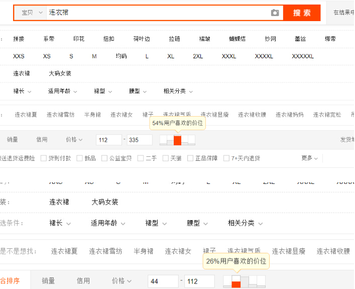 可以看到上面这两张图,54%消费群体喜好112-335这个价格区间的,26%的客户群体喜好44-112的这个价格区间,那么这就可以根据我们产品的性价比和利润空间在这两个区间进行主推款以及辅助款的定价,以达到获取更大消费者认同度的价格定位。